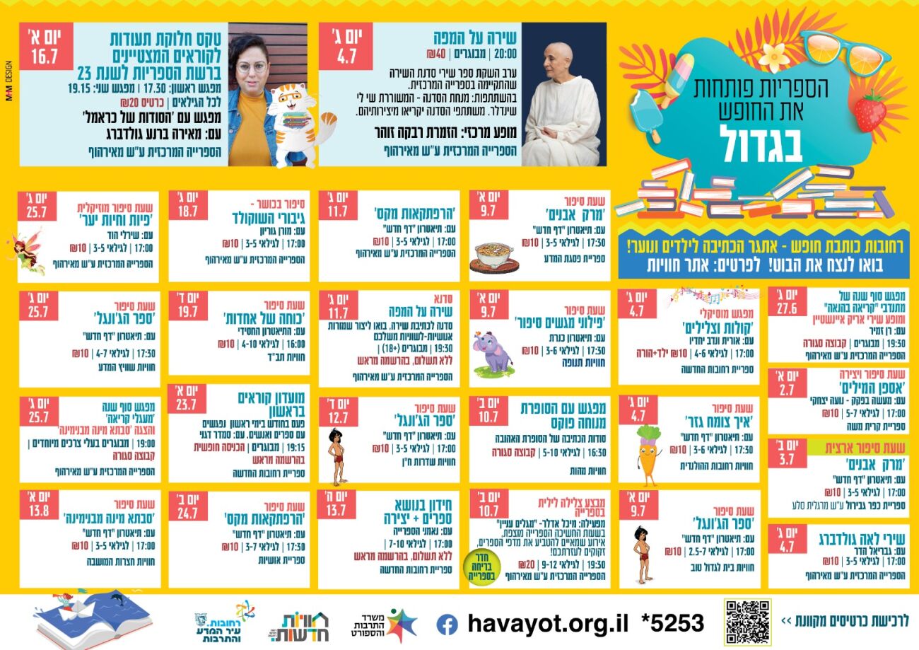 רשת חוויות משיקה מיזם ייחודי לעידוד קריאה בחופש "הספריות פותחות את החופש בגדול", המתקיים זו השנה השלישית בעיר! עם עשרות אירועים בסניפי הספריות שבמרכזים הקהילתיים בשכונות העיר ובאירועי שיא בספרייה המרכזית. האירועים יתקיימו במהלך כל חודש יולי, בעלות השתתפות סמלית בלבד והם מותאמים לגילאים ולקהילות מגוונות. בין האירועים ניתן לבחור מתוך עשרות שעות סיפור ויצירה, של מיטב הרפרטואר העדכני לספרי ילדים ועד לשירי לאה גולדברג הנצחיים, עוד יתקיימו מפגשים מוסיקליים, חידון מיוחד וגם "מבצע צלילה לילית"- חדר בריחה לנוער, שייפתח בשעת הערב בספרייה המרכזית.