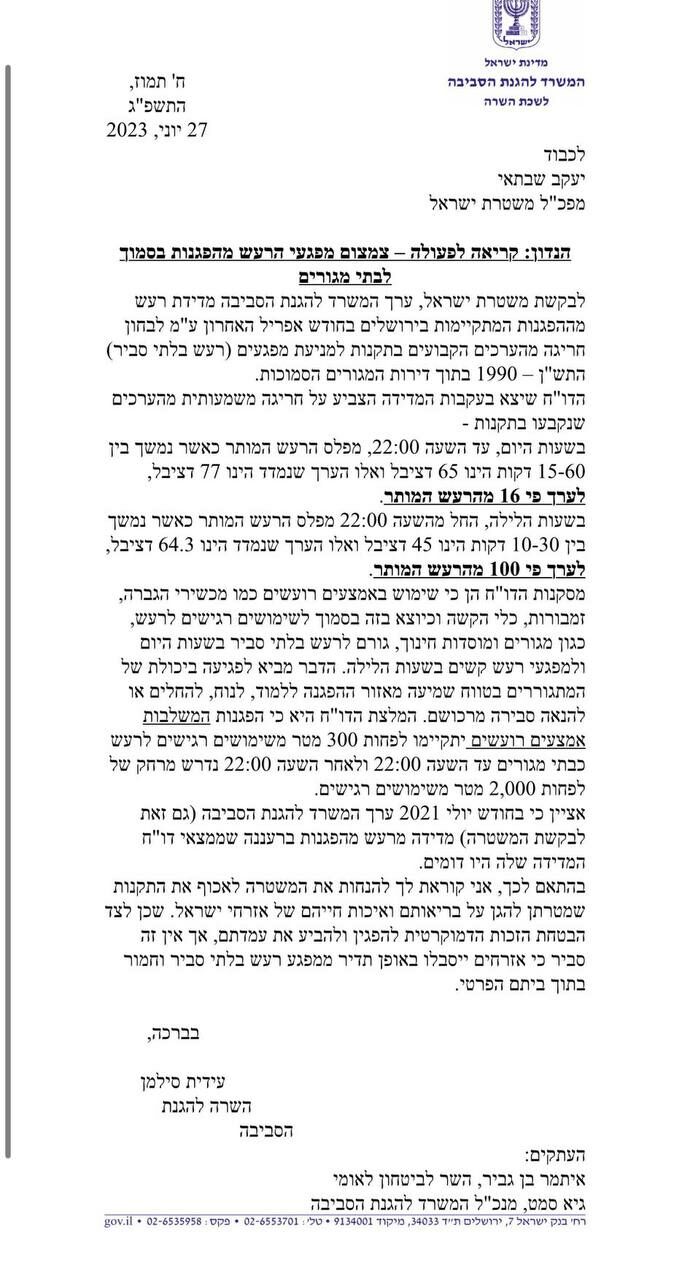 לטענת השרה נעשו מדידות בזמן הפגנות ונמדד רעש חריג של כ - 50% מעל מה שמותר והשרה דורשת שההפגנות הרועשות יתקיימו כ - 2000 מ' לפחות מבתי התושבים.
