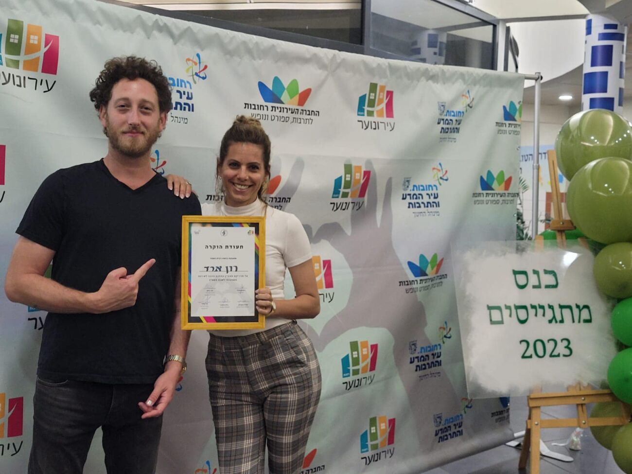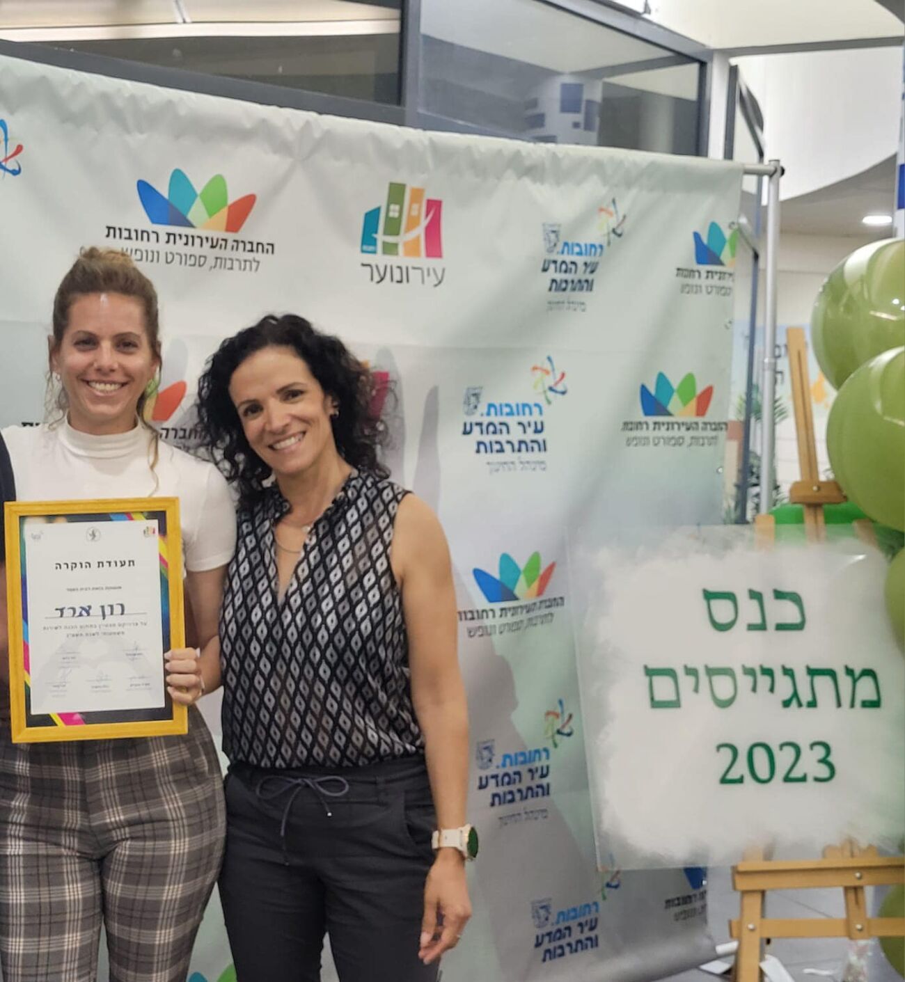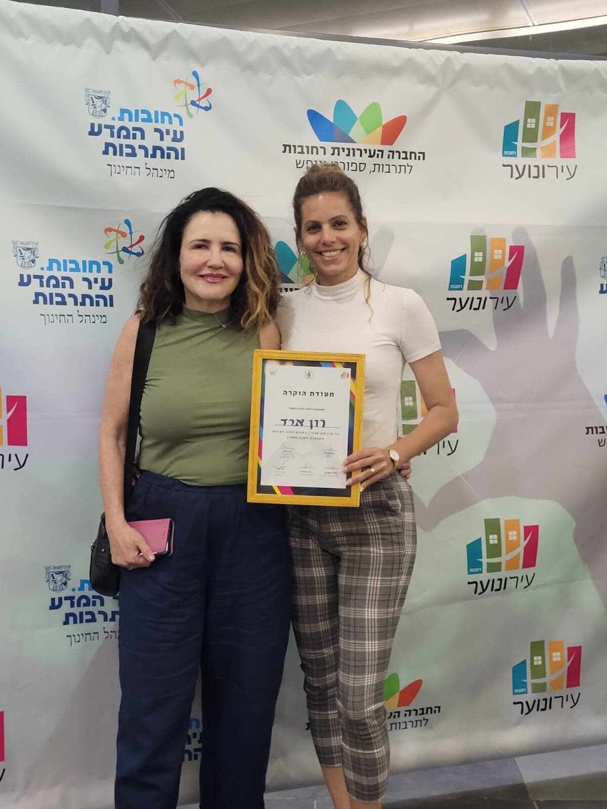 רכזת צה"ל שרון רוזנצוייג ונציגת הנהגת ההורים אושרת גוזלן מבית ספר אמית רון ארד ברחובות קבלו אות הוקרה רשותי על מיזם הכנה לשירות משמעותי לצה"ל שהתקיים בבית הספר