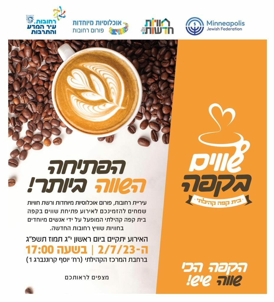 עיריית רחובות, רשת חוויות, פורום אוכלוסיות מיוחדות ומחזיקת תיק אוכלוסיות מיוחדות, אורית שרגאי, מזמינים את התושבים לאירוע הפתיחה של הסניף הראשון של "שווים בקפה", בית קפה קהילתי בו יעבדו צעירים עם צרכים מיוחדים בחוויות שוויץ רחובות החדשה.