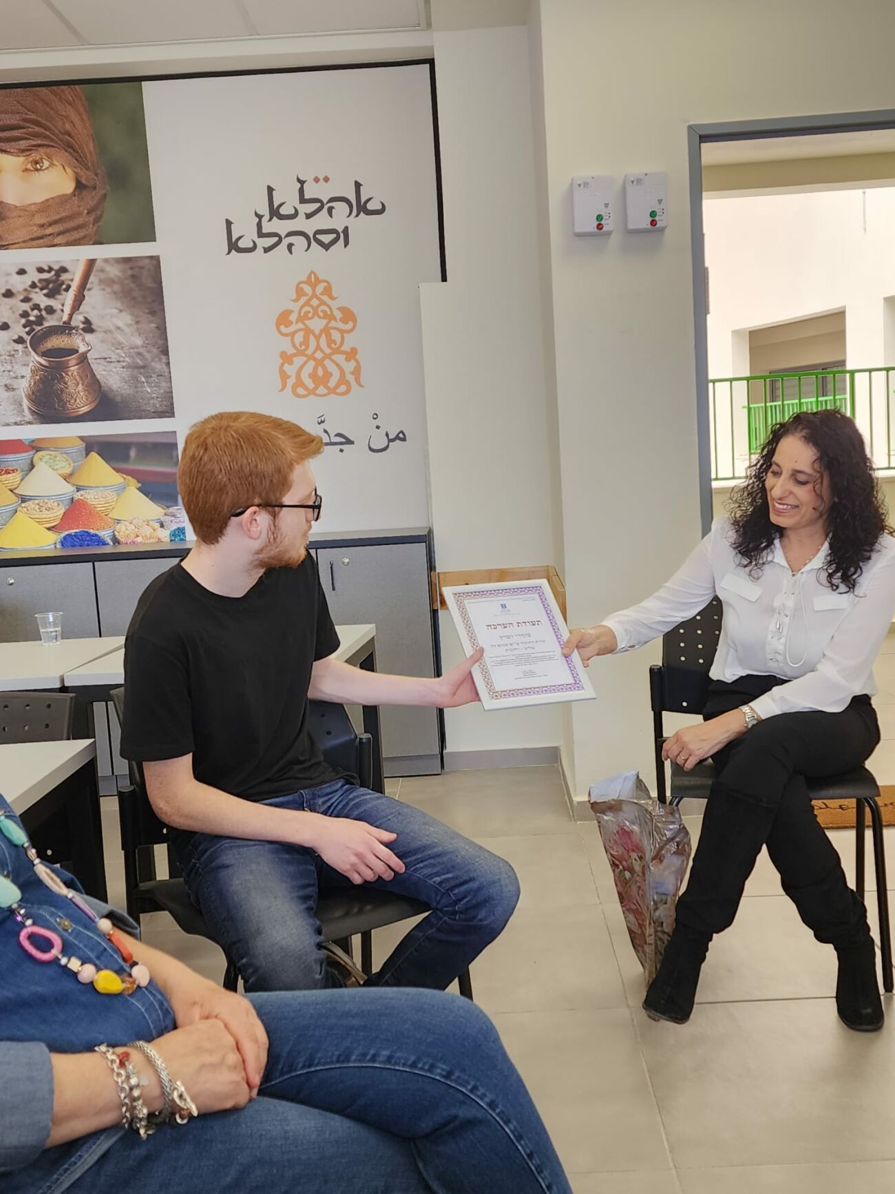 את התעודה העניקה לעמרי המדריכה המחוזית זהבית דבס בנוכחות הצוות החינוכי והנהלת בית הספר.