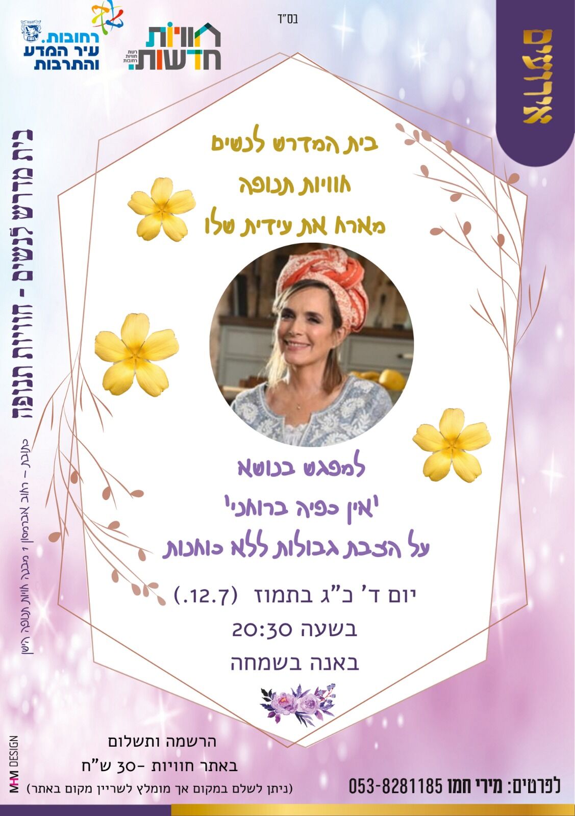 בית המדרש לנשים חוויות תנופה מארח את עידית שלו למפגש בנושא: "אין כפיה ברוחני" - על הצבת גבולות ללא כוחנות