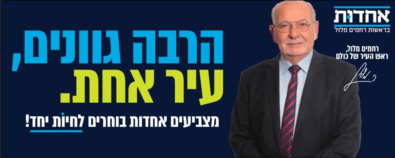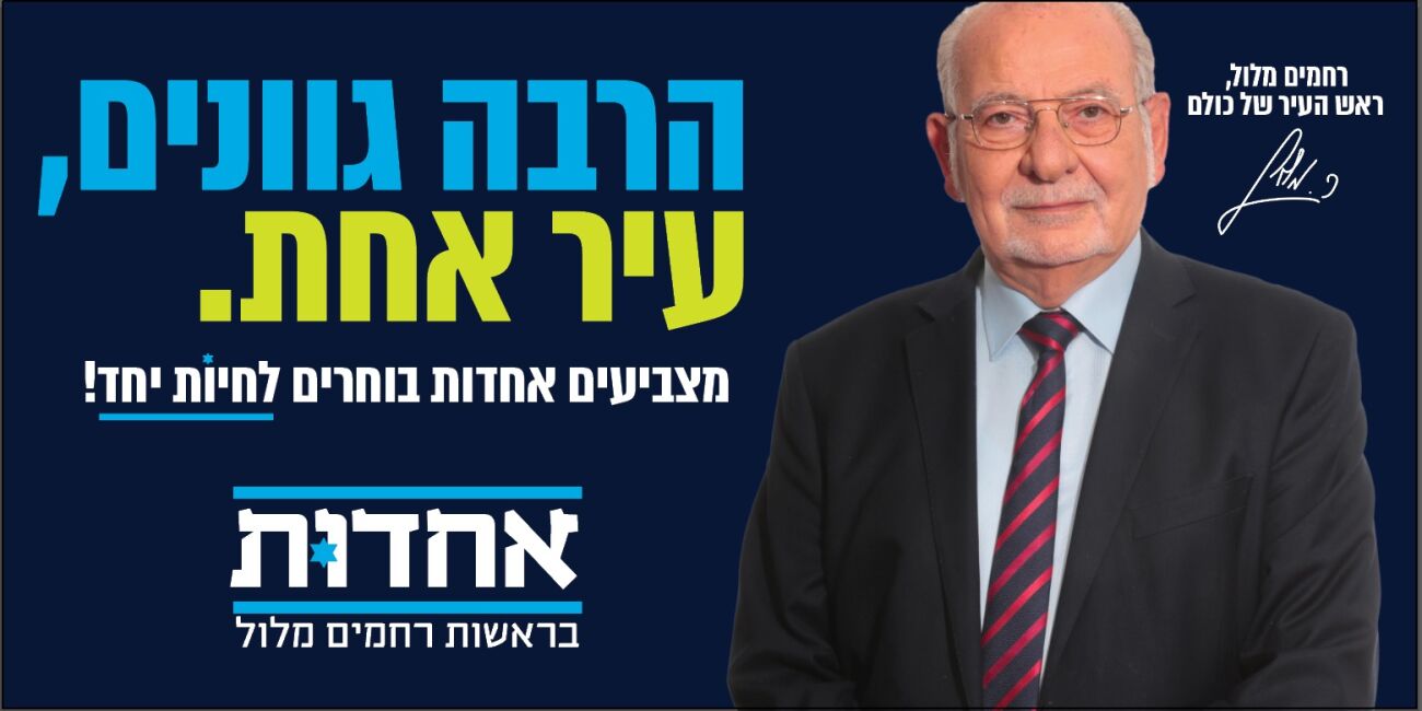 לאחר שהודיע על הקמת הסיעה העצמאית והעל- מפלגתית "אחדות" ולאחר שחשף את הסקר של מכון הסקרים "מאגר מוחות" בראשות יצחק כץ ולפיו הוא צפוי להמשיך לקדנציה נוספת, היום משיק ראש העיר רחמים מלול את קמפיין סיעת "אחדות", תחת הסלוגן: "הרבה גוונים, עיר אחת!".