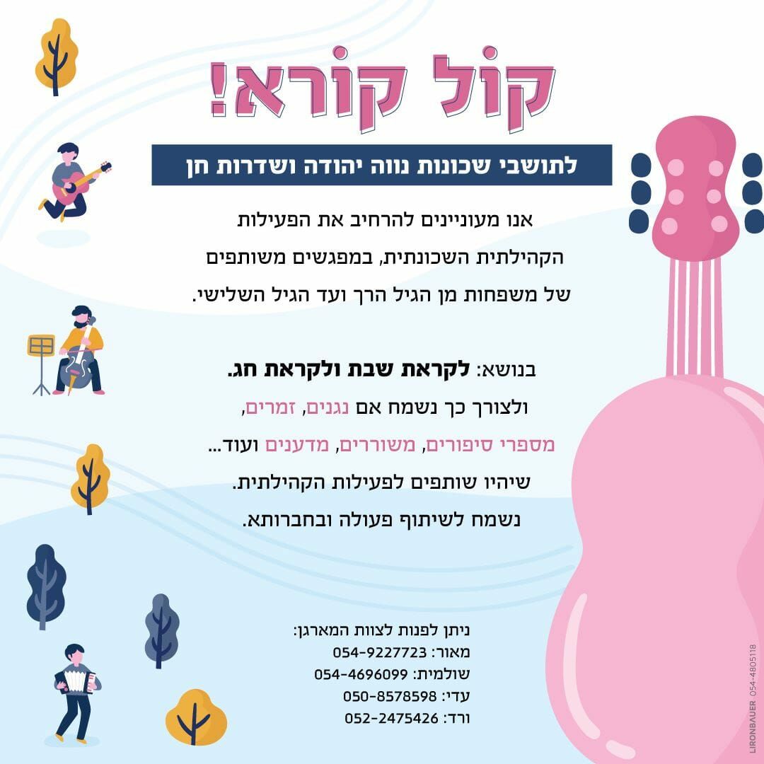 תושבי שד' חן ונווה יהודה ברחובות יוצאים בקול קורא לנגנים, מספרי סיפורים, זמרים, המעוניינים לקחת חלק באירועי קבלת שבת שעתידים להתקיים בשכונה