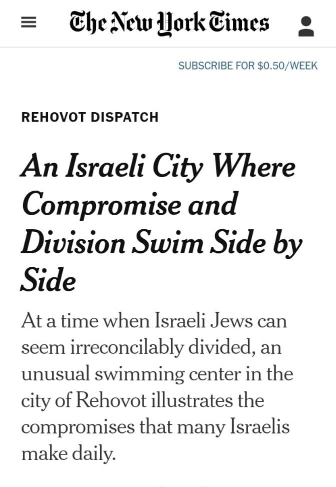 רחובות נחתה על פשרה, מהסוג שממחיש את המציאות ההיברידית של חיי היום-יום בישראל, שבה יהודים מרקע שונה מוצאים מכנה משותף רעוע אך פונקציונלי. מרכז השחייה מעניק לישראלים שתי דלתות: אחת משמאל לבריכה הדתית, שבה גברים ונשים מתחלפים בשחייה, ואחת מימין לשחיינים חילונים, שבה נשים וגברים שוחים יחד כל השבוע.