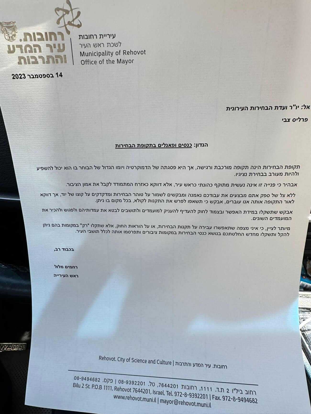 להלן פניית ראש העיר ליו"ר וועדת הבחירות ברחובות