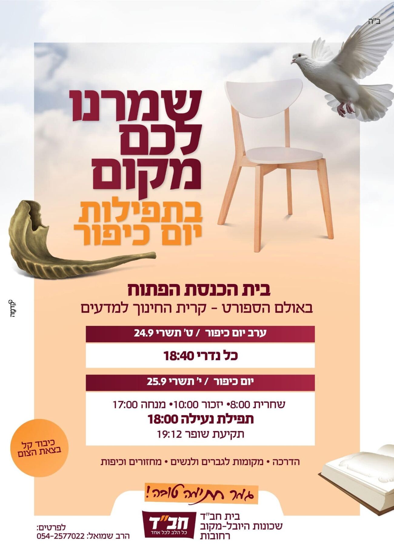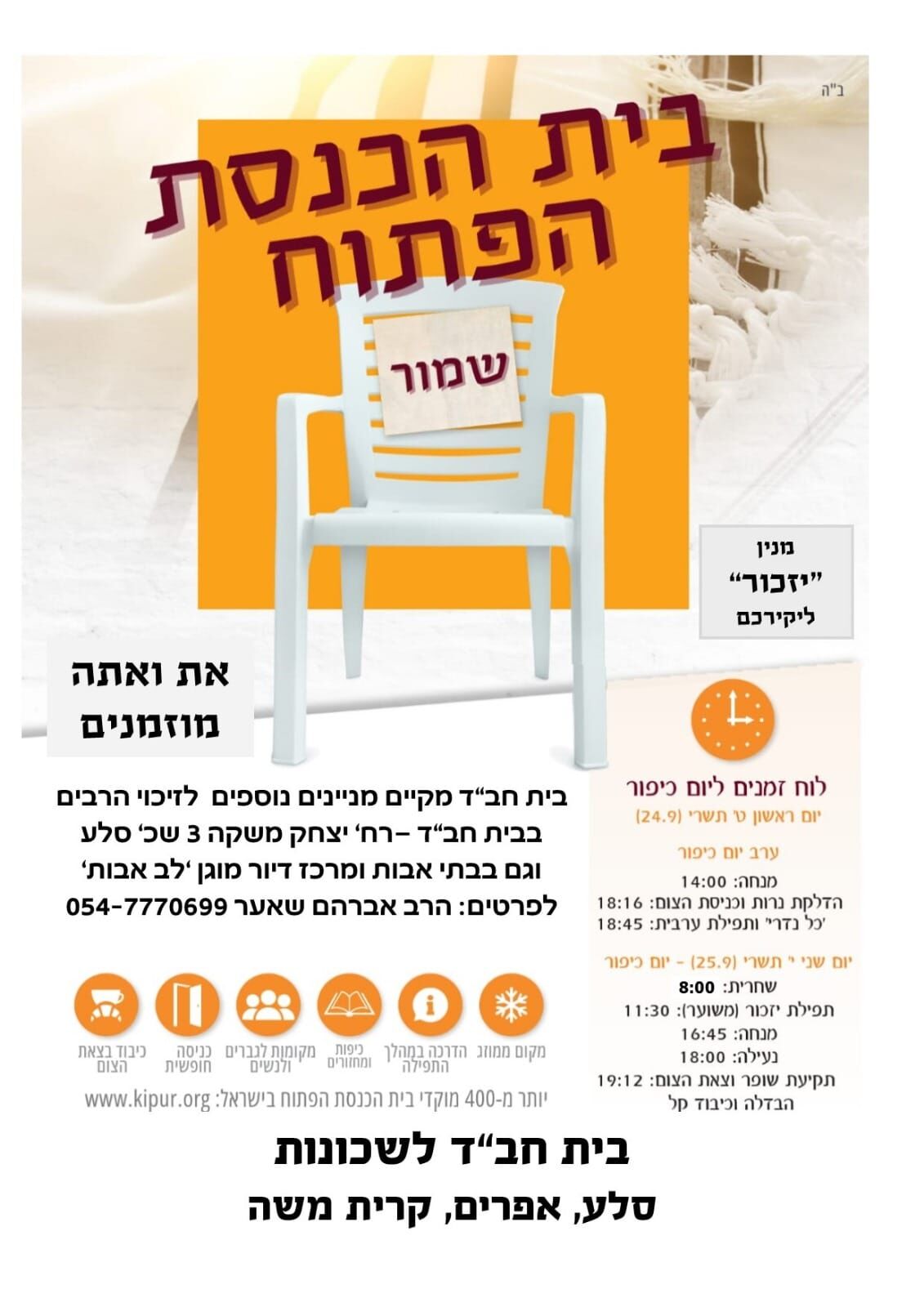 גם השנה בתי חב"ד בישראל מזמינים את התושבים לבתי הכנסת הפתוחים של יום הכיפורים בו יוכלו להתפלל יחד עם הקהילה. השנה יפתחו בתי חב"ד רחובות מוקדי תפילה בשכונות: