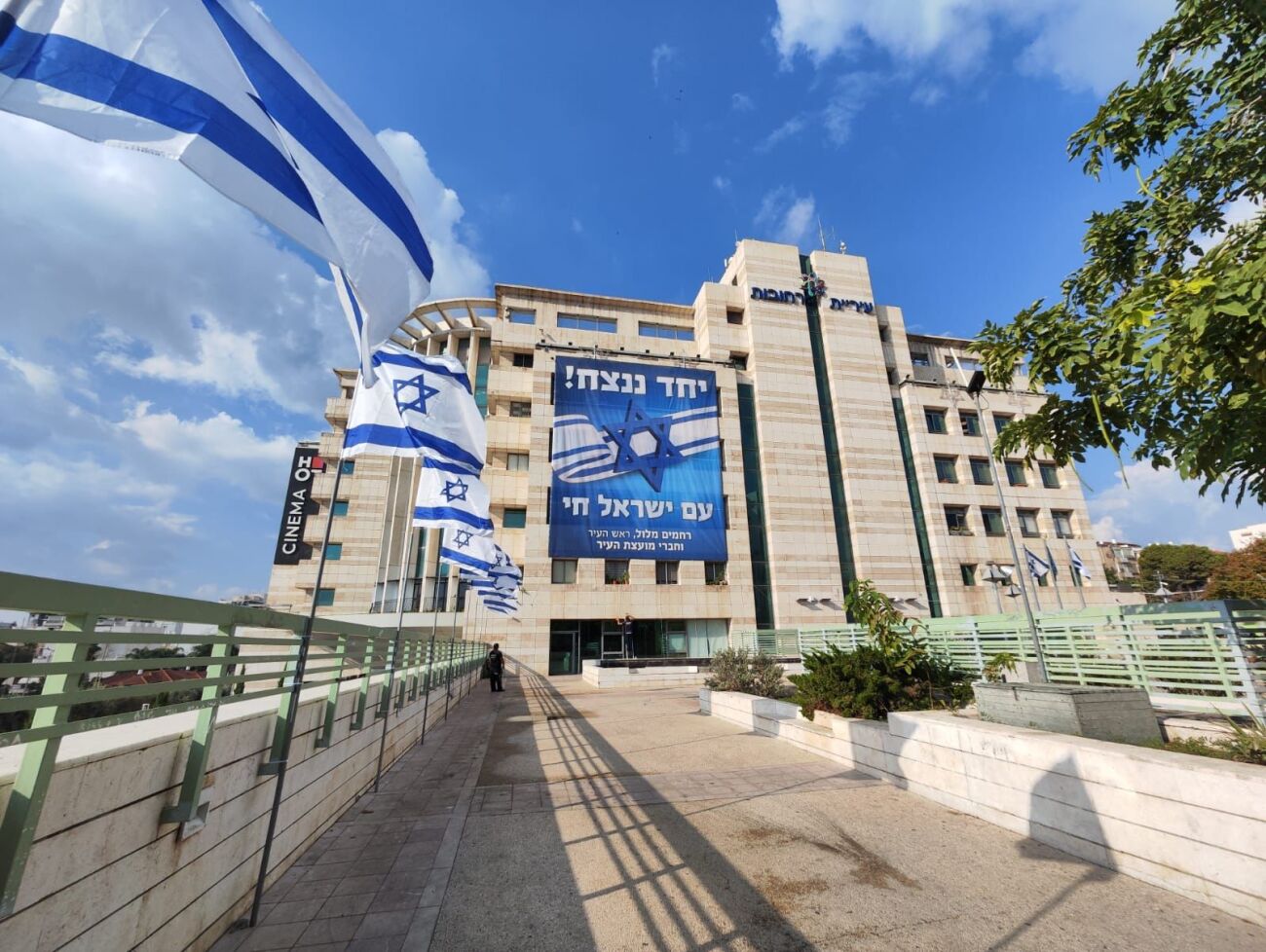 עיריית רחובות ממשיכה בחיזוק החוסן העירוני עם קמפיין ״יחד ננצח- עם ישראל חי״, ושלט ענק ברוח זו נתלה על בניין העירייה