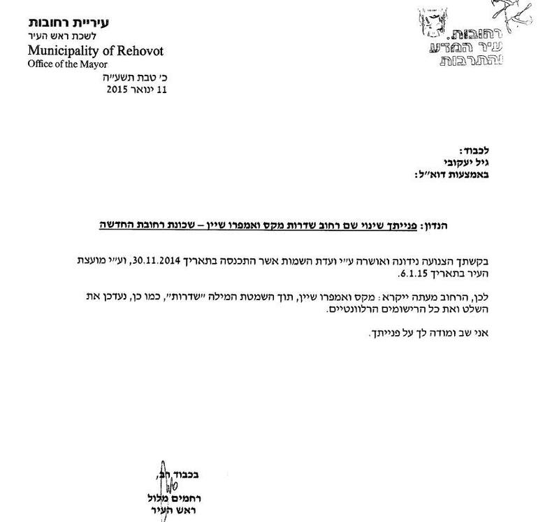 ראש העיר נענה לבקשת תושב משכונת מקס שיין ברחובות החדשה לשנות את שם רחוב "שדרות מקס ואמפרו שיין" לשם חדש "מקס ואמפרו שיין"... (המילה שדרות הושמטה)