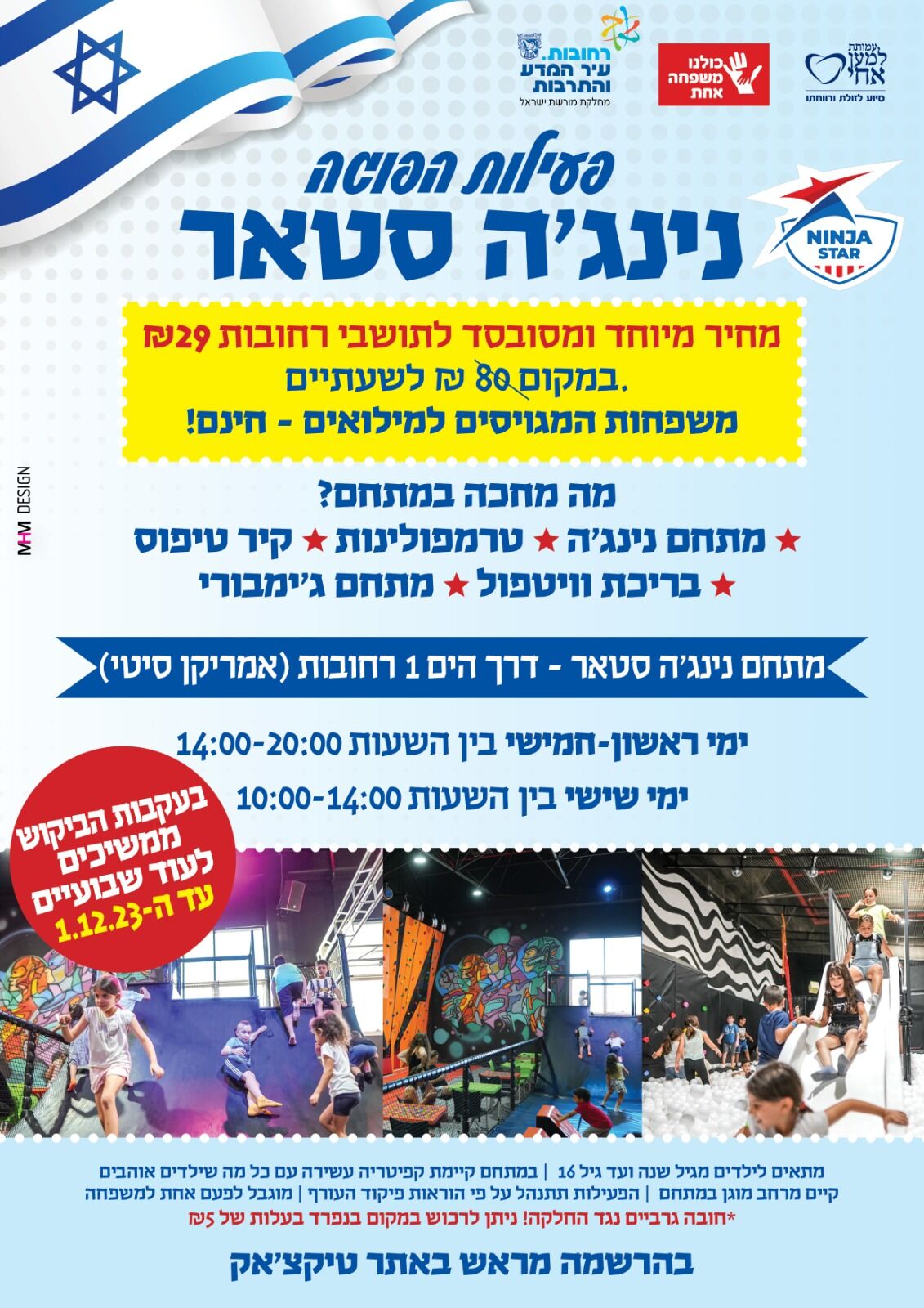 אמיתי כהן: לאור הביקוש בשבועיים הקרובים משפחות העיר רחובות ימשיכו ליהנות מכניסה ב29 ש"ח למתחם "נינג'ה סטאר" באמריקן סיטי, משפחות מגויסי המילואים מוזמנות להיכנס בחינם בהרשמה מראש