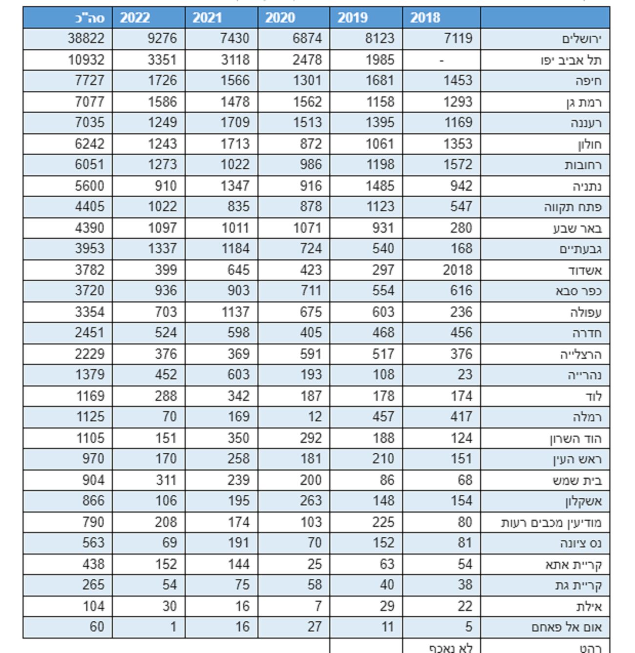 העיר שנמצאת בראש הרשימה ופקחיה חילקו הכי הרבה דו"חות בגין חניה אסורה בחניית נכים בשנת 2022 היא ירושלים, שבה נרשמו 9,276 דו"חות בגין עבירה זו. העיר השנייה ברשימה היא תל אביב-יפו בה נרשמנו 3,351 דו"חות בשנת 2022. העיר שסוגרת את השלישייה הפותחת היא חיפה, בה חולקו 1,726 דו"חות בגין חניה אסורה בחניית נכים.