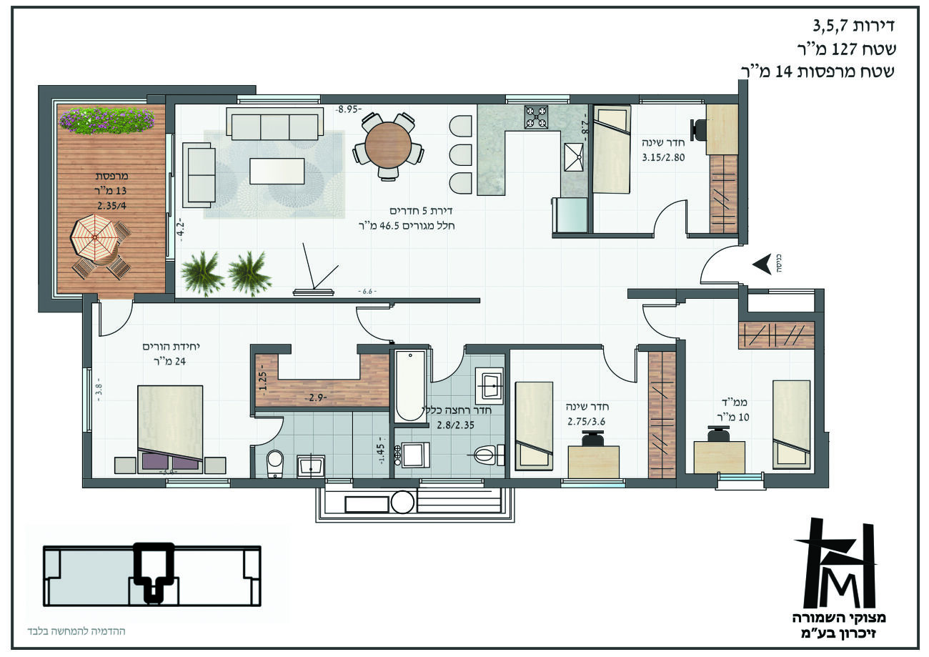 דירת 5 חד, 127 מ', עורף, מרפסת גדולה 14 מ', סה"כ 141 מ"ר