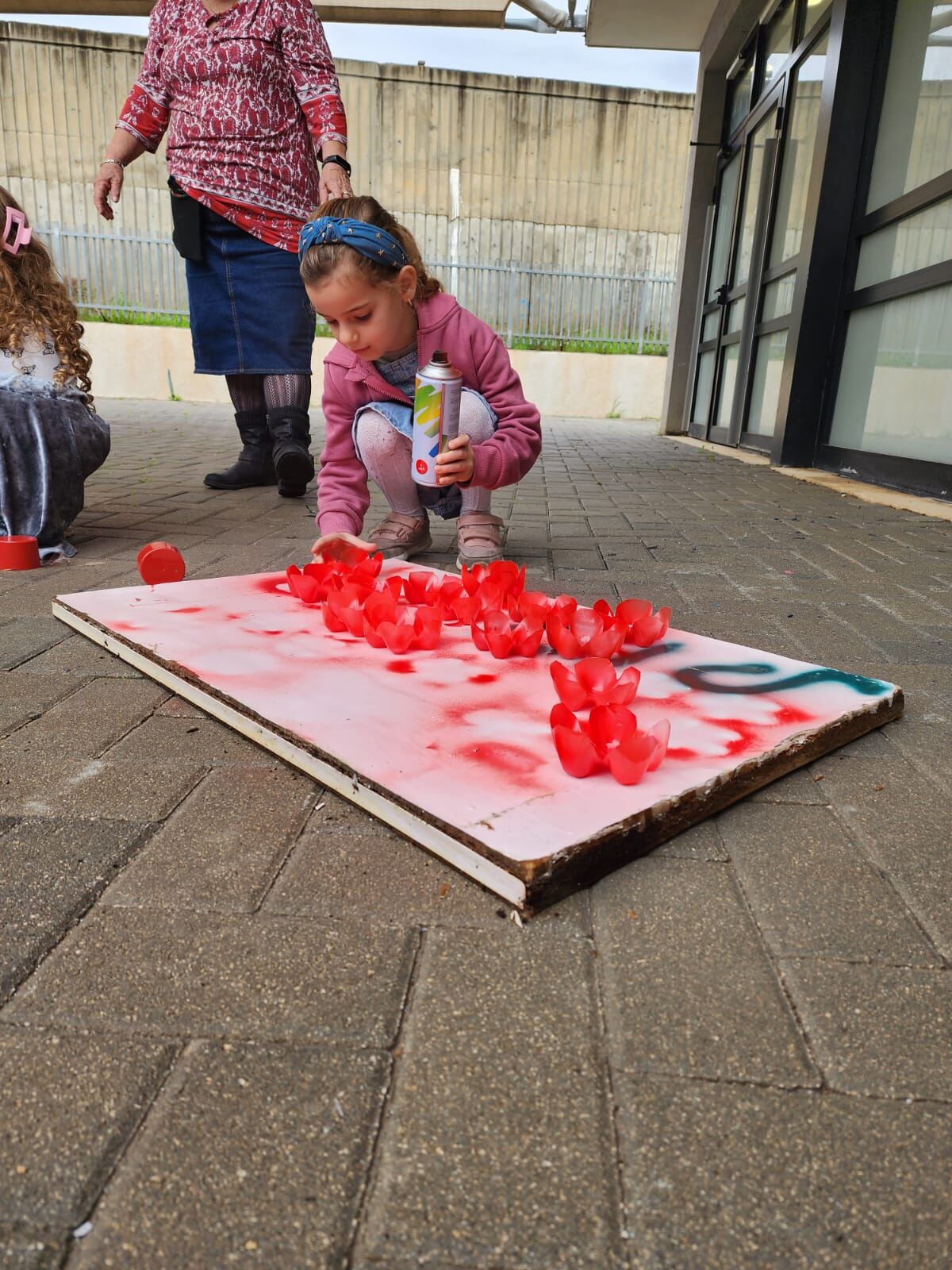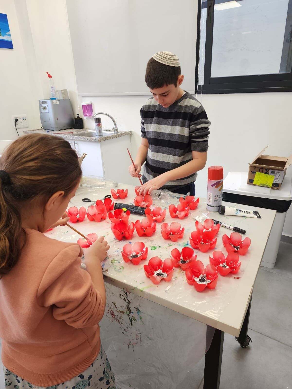 בגינה האקולוגית של המרכז הקהילתי נערך היום, 27.12, טקס להצבת מיצג כלניות מחומרים ממוחזרים