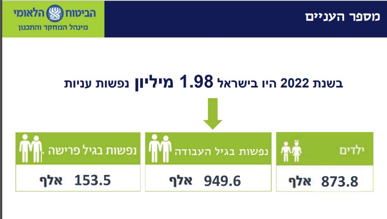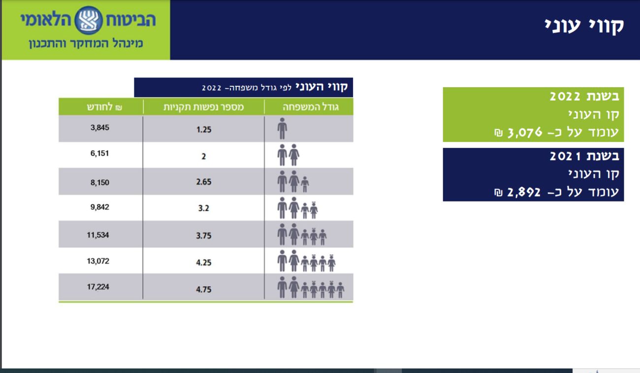 קו העוני עמד בשנת 2022 על 3,076 ש"ח. הדוח מראה כי 949.6 אלף נפשות עניות הן בגיל העבודה.