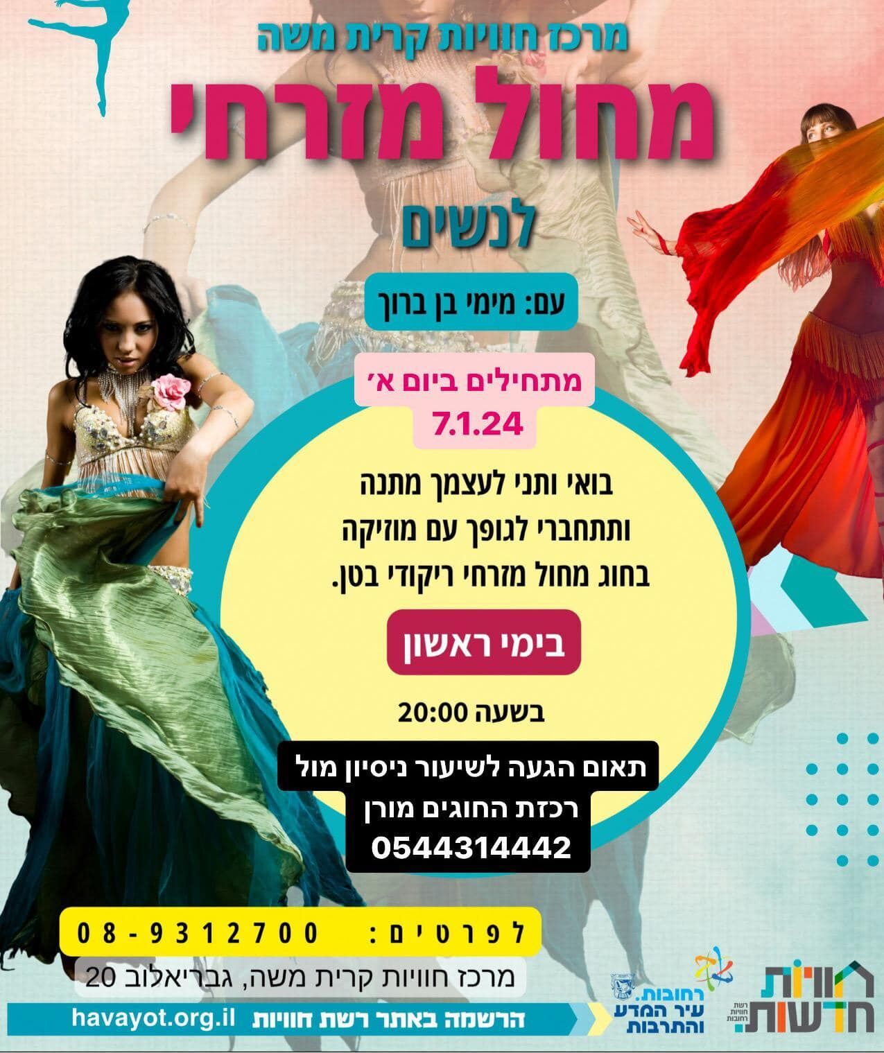 ביום א' הקרוב 7/1 ייפתח בחוויות קרית משה חוג מחול מזרחי - ריקודי בטן בהדרכת מימי בן ברוך. לתאום הגעה לשיעור ניסיון, ניתן ליצור קשר עם מורן במספר 0544314442.