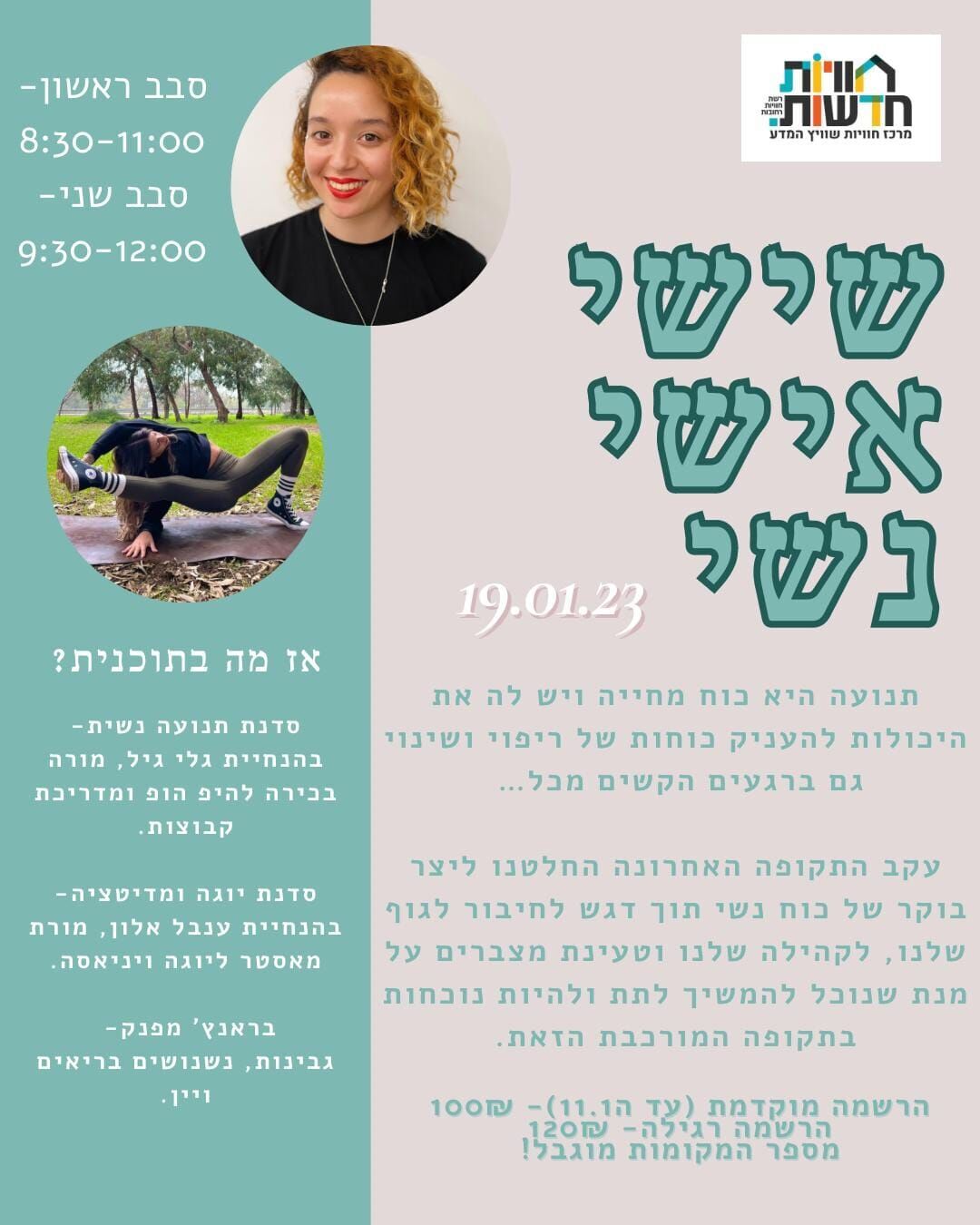 בוקר שישי נשי חדש יוצא לדרך בחוויות שוויץ המדע רחובות 19/1/24, מיועד לנשים בגילאי 18 ומעלה. המפגש יתמקד בתנועה ובחיבור לגוף ולנפש, תוך יצירת מרחב לפריקת אנרגיה ולשיתוף חוויות. המשתתפות מתבקשות להגיע בבגדים נוחים ולהביא את עצמן כפי שהן. אין צורך בניסיון קודם בתחום, והמעוניינות לקבל מידע נוסף או להתייעץ יכולות לפנות בפרטי לארגון. לפרטים נוספים והרשמה: לחצו כאן.