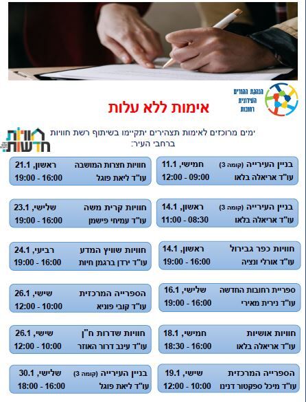 הנהגת ההורים ברחובות ממשיכה בשירות להורים - אימות חתימה בפני עו"ד לצורך רישום לבתי הספר והגנים בבניין העירייה, מרכזי חוויות: קריית משה, שוויץ המדע, הספרייה המרכזית, ומתנ"ס שד' חן