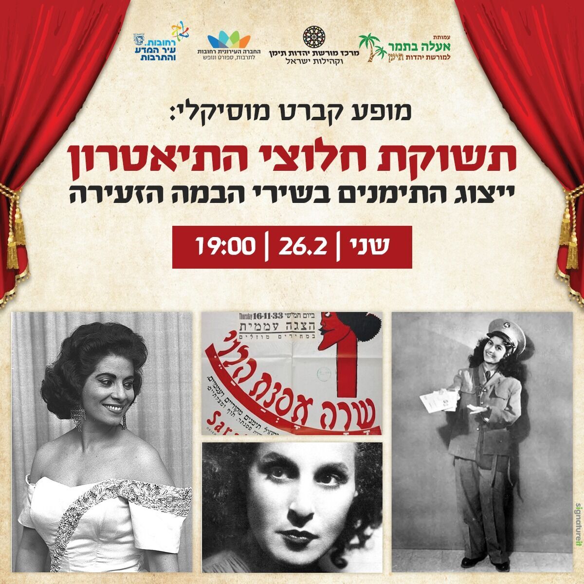 מופע קברט המספר על ראשית ימי ישראל לצד סיפורו של תיאטרון "אהל" (1925), שהיה חלוץ בבניית חיי התרבות בתל אביב הקטנה וסיפורן של הזמרות ממוצא תימני שושנה דמארי, ברכה צפירה, שרה־אסנת הלוי ואסתר גמליאלי ־ במרכז מורשת יהדות תימן ברחובות - כרטיסים ב-30 ש"ח