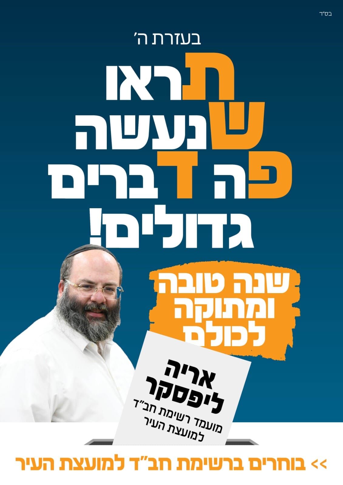 חב"ד בעירייה עוזרים לכולם בראשות אריה זאב ליפסקר תיוצג באותיות חי