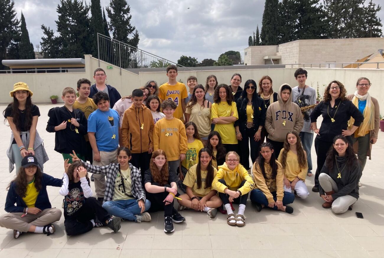 תלמידי קריית החינוך דה שליט הגיעו לבושים בצהוב ובחרו להתחיל את היום בתמונה משותפת בכניסה לבית הספר עם השלט: עם ישראל חי והבקשה שחוזרת על עצמה מאותה שבת של ה-7.10- BRING THEM HOME.