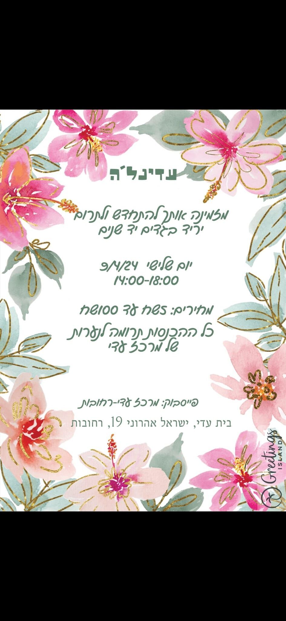 מרכז עדי ברחובות מזמין את הציבור ליריד פסח המתקיים במתחם. היריד יתקיים ביום שלישי, ה-9 באפריל 2024, ויהווה הזדמנות לרכוש מתנות לחג. המארגנים מזמינים את הנשים והנערות לתרום בגדים, תרומה שתשמש לטובת הקהילה.