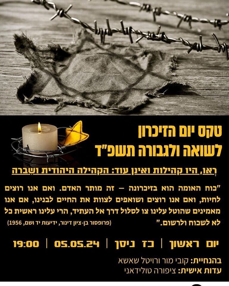 טקסי יום השואה ברחובות : במרכז חוויות שוויץ ברחובות החדשה גב' ציפורה טולידאני תספר את סיפורה ואת סיפור משפחתה בשואה. האירוע פתוח לקהל הרחב - 5 במאי 2024, 19:00