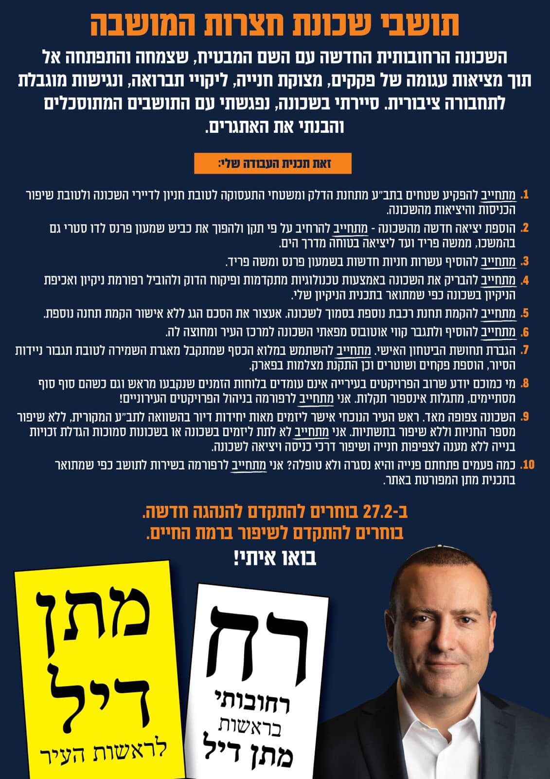 מכיוון שהתקופה הייתה ימי בחירות מתן דיל הוציא בתאריך 19/2/2024 פלאייר לתושבי השכונה ובה הוא מתחייב כי אם ייבחר יפעל נגד התוכנית להגדלת זכויות הבנייה בשכונה בלא מתן מענה לבעיות התחבורה בשכונה ולמחסור במקומות חנייה.