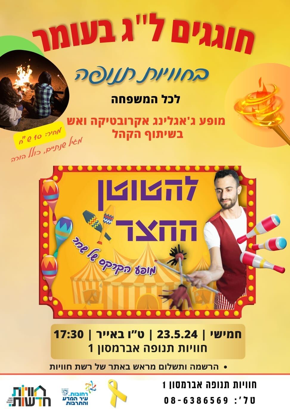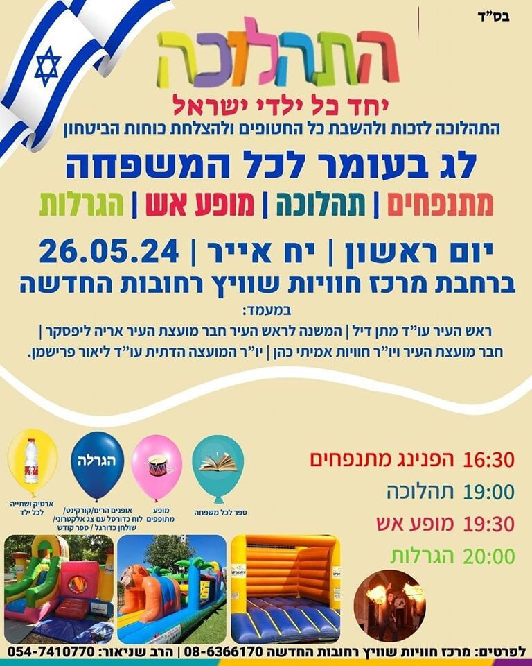 • הפנינג ל"ג בעומר לכל המשפחה בשיתוף חב"ד: תהלוכה, מופע אש, בינגו נושא פרסים - שוויץ רחובות החדשה