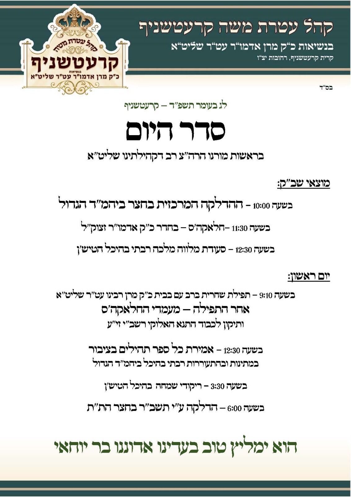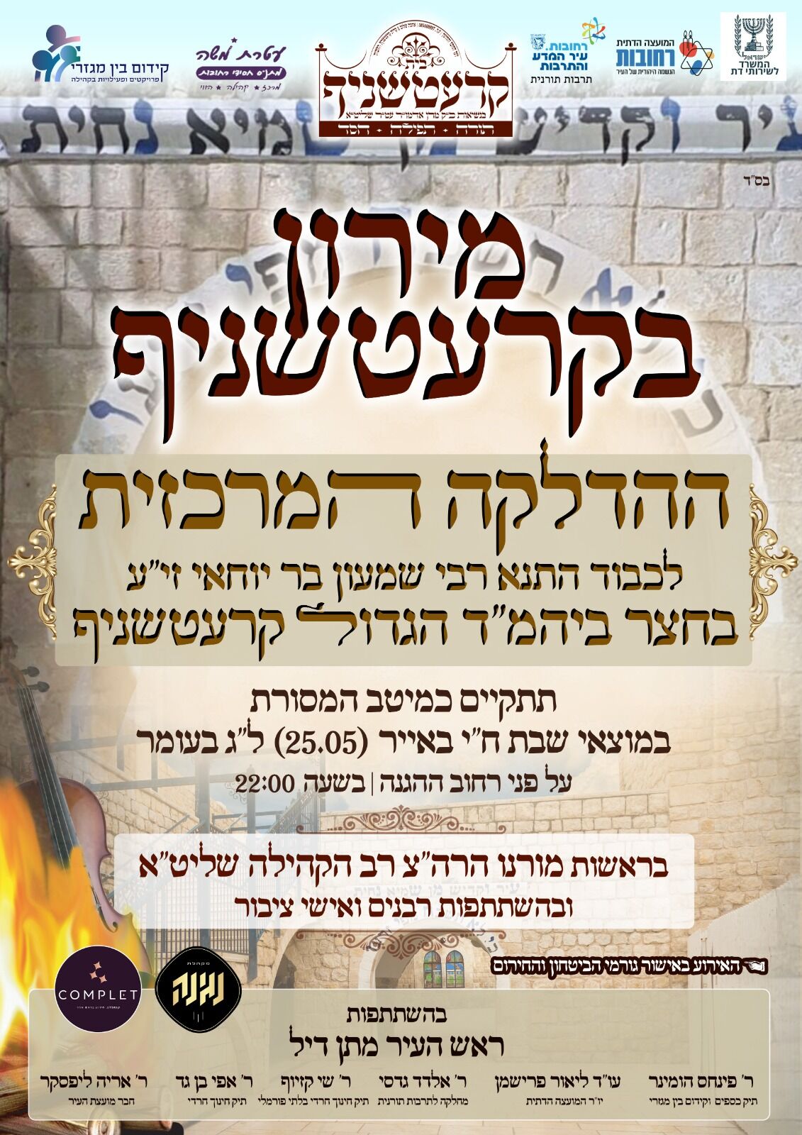 בהשקעה גדולה ובאישור גורמי ביטחון. ההדלקה המסורתית הגדולה ברחובות. בחצר קהילת קרעטשניף תתקיים במוצ"ש 25/5 בשעה 22:00 בלילה