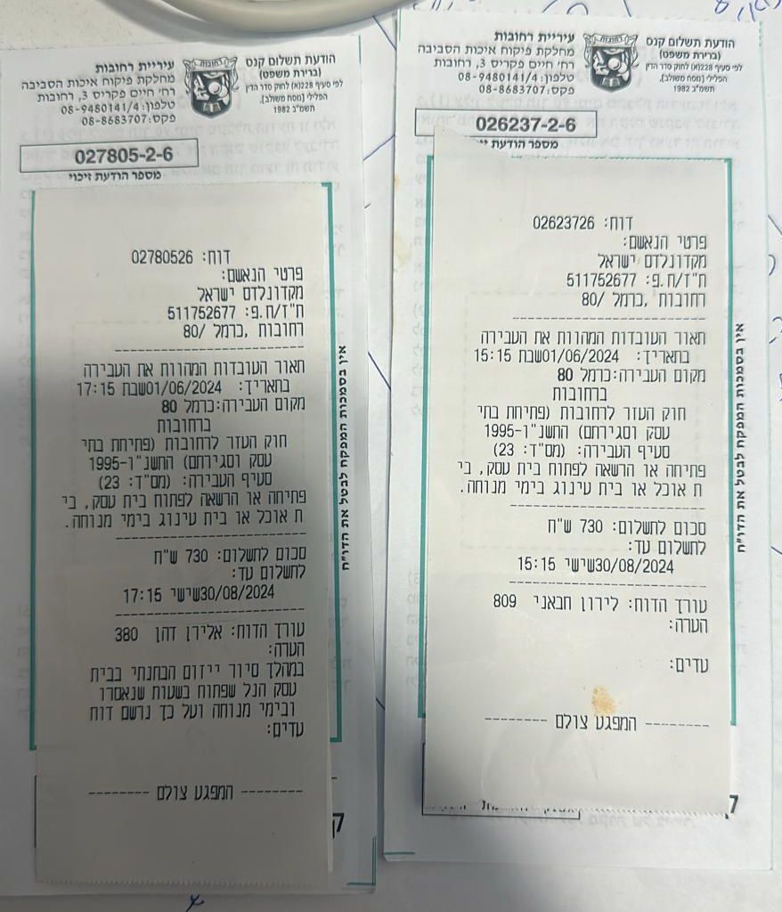 "הגיעו אלי ידי צילומי שני הדוחות, ולאחר ששוחחתי עם גורם בכיר ברשת מקדונלדס על המצב שאליו נקלעו, אני באמת תוהה כיצד יוצאת הנחייה מצד אחד לתת דו"ח אחד (יותר מידי), אך בפועל מגיעים שניים. האם זו דרך הפעולה להרדמת התושבים?"
