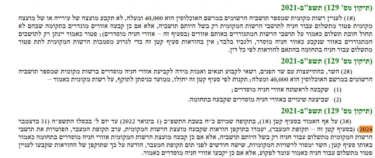 בשנת 2021 קבעה ועדת הכלכלה את תיקון פקודת התעבורה כי רק רשות מקומית עם 40 אלף תושבים ומעלה תוכל להעניק חנייה חינם לתושביה אך ורק אם קבעה אזורים מוגדרים בהם תוענק ההטבה-ההטבה תהיה לתושב המתגורר באותו אזור לתושבים. על כן נתנה הועדה לרשויות 3 שנים להסדיר את הנושא כלומר עד סוף שנת 2024. רשות מקומית שלא הגדירה את אזורי החנייה לא תוכל להעניק פטור מתשלום לתושביה רק מעצם היותם תושבי הרשות אלא אם כן תסדיר זאת. בהתאם לכך כפי שנקבע חצי שנה לפני תחילת התוקף אמש הוציא משרד התחבורה תזכורת לרשויות על הנושא.