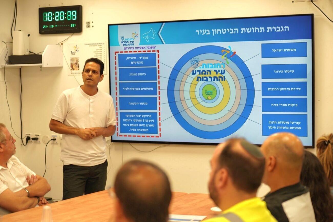 בתום דבריו של ראש העיר, אופיר מזרחי, מנהל אגף הביטחון הנכנס הציג את העשייה של העיר בשעת חירום באירועי הביטחון שהתקיימו החל מיום ה-7/10/2023. מזרחי סקר את כלל אירועי נפילות הטילים והיירוטים בעיר והפעולות הרבות שיזמה עיריית רחובות כדי להגביר את תחושת הביטחון של תושבות ותושבי העיר, החל מהקמת כיתת כוננות, גיוס מתנדבים למשמר השכונות, שיתוף הפעולה עם פיקוד העורף בפרויקט בני המקום ועוד.