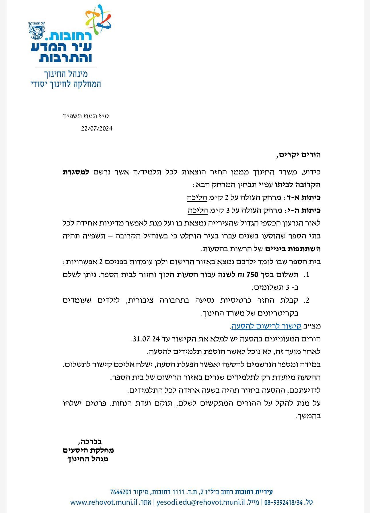 - אורחזה מדובר לילדים בחינוך מיוחד , או לילדים ששנה שעברה כבר היו במערך ההסעות של העיריה בלבד. תודה29.07.24 22:04 תגובה