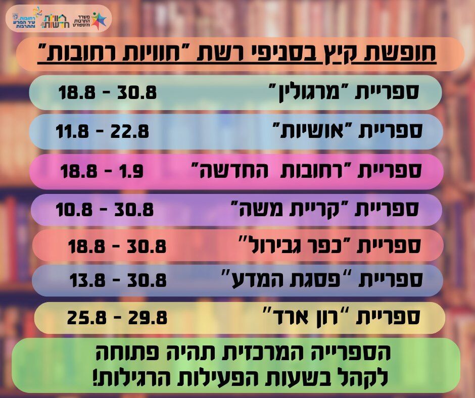 במהלך חודש אוגוסט יחולו שינויים בשעות פעילות רשת הספריות של חוויות ברחובות