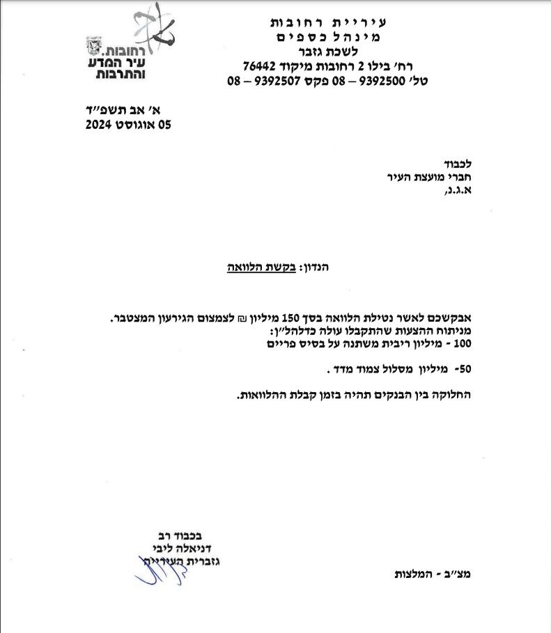 עיריית רחובות מתכוונת להגיש בקשה להלוואה של 150 מיליון ש"ח מהבנקים לאור הקשיים הכלכליים שבה היא נמצאת