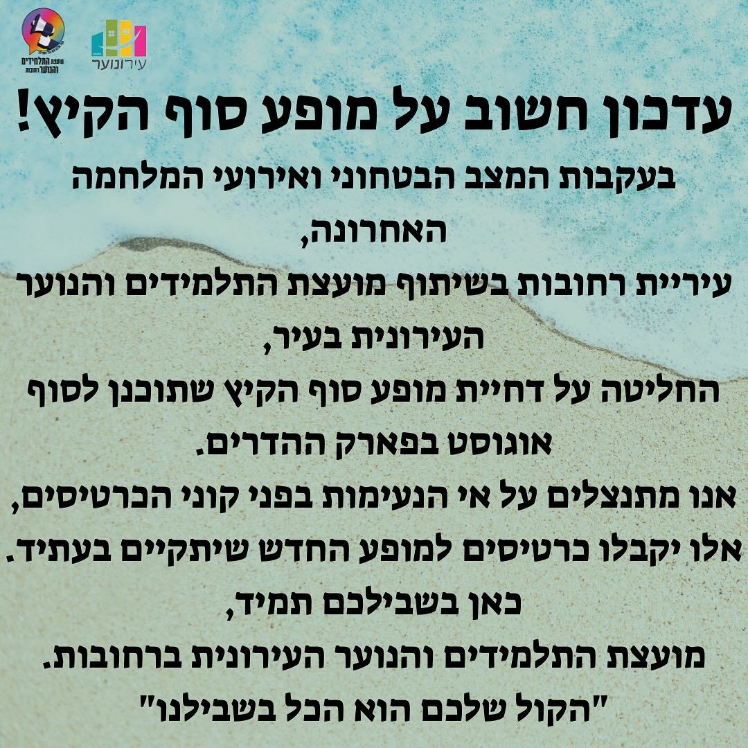 לאור המצב הביטחוני עיריית רחובות ביטלה את מופע סוף הקיץ שתוכנן להתקיים לבני הנוער בפארק הדרים