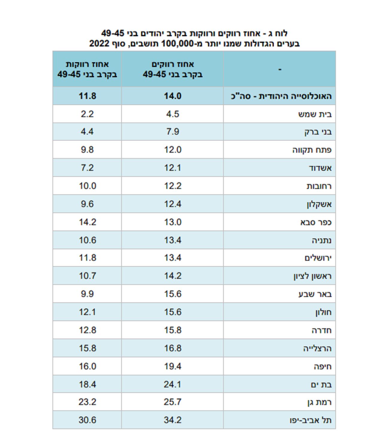 מבין הערים הגדולות בתל אביב, הרצליה, רמת גן ובת ים מאופיינות באחוז גבוה של רווקים/ות בקרב בני 45-49 לעומת בני ברק ובית שמש בהן נמצא אחוז הרווקים/ות בקבוצת גיל זאת.