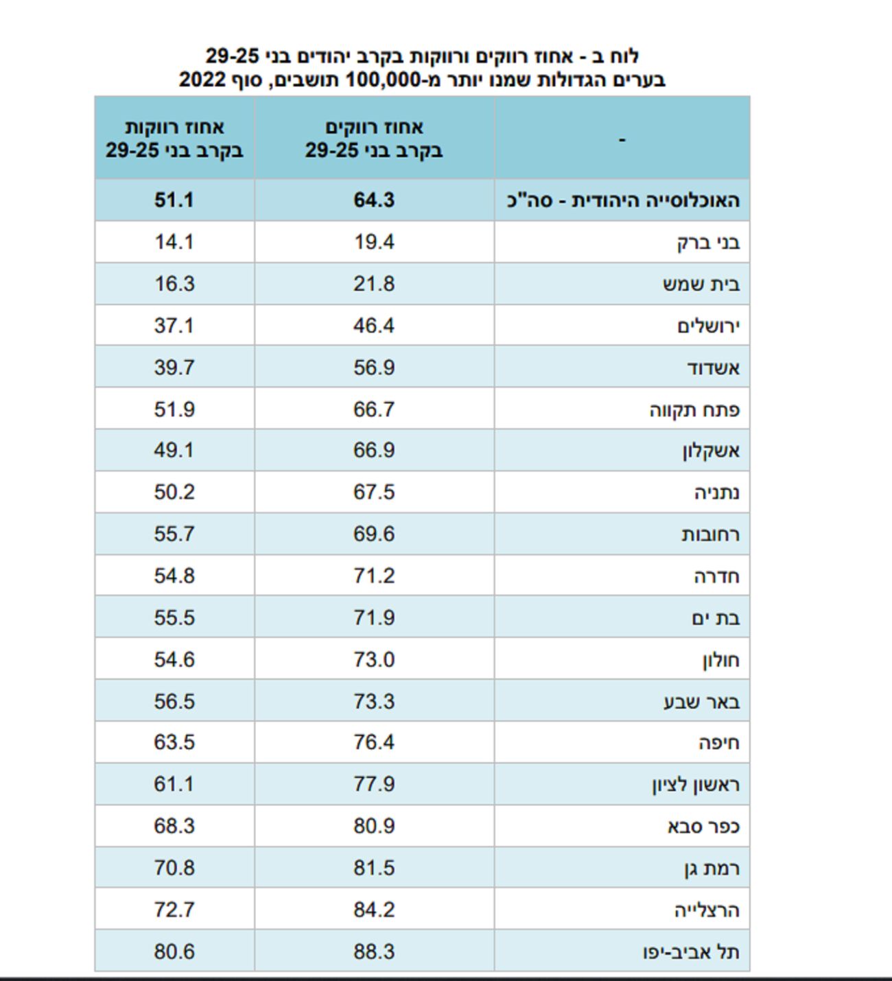 בערים תל אביב, הרצליה ורמת גן קיים אחוז הרווקים/ות הגדול בקרב בני 25-29 לעומת הערים בית שמש, בני ברק וירושלים בהן נמצא האחוז הנמוך בקרב בני אותו גיל.