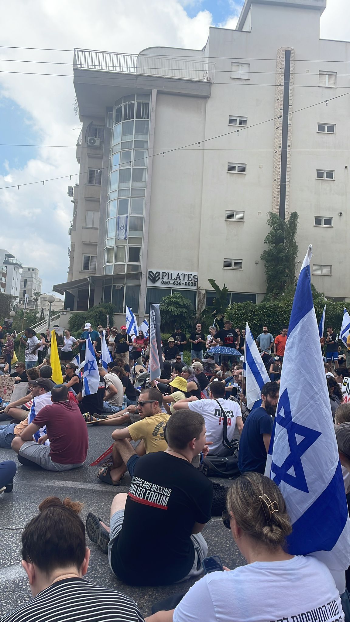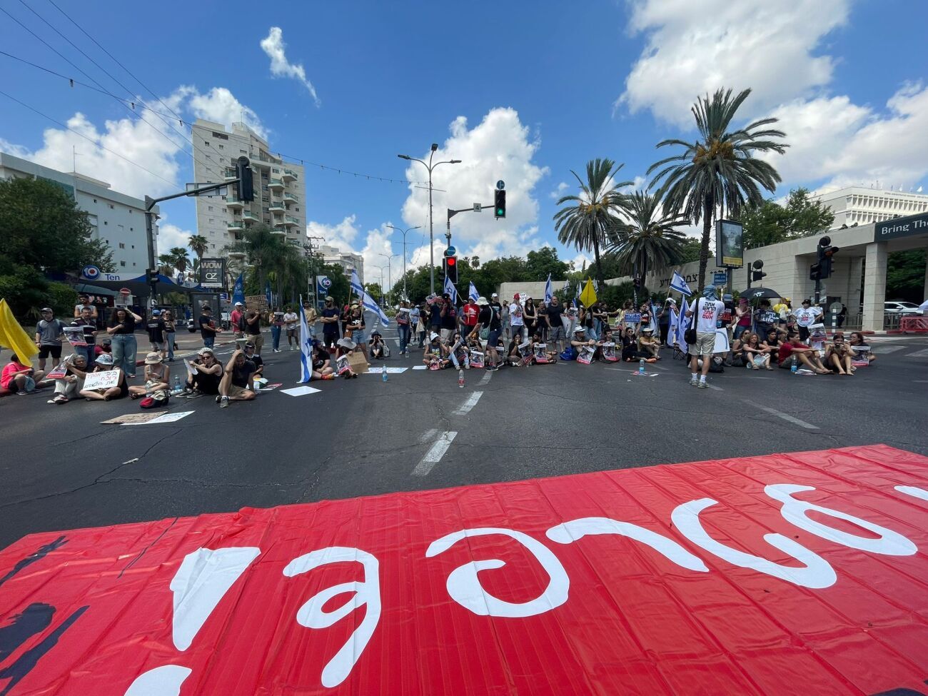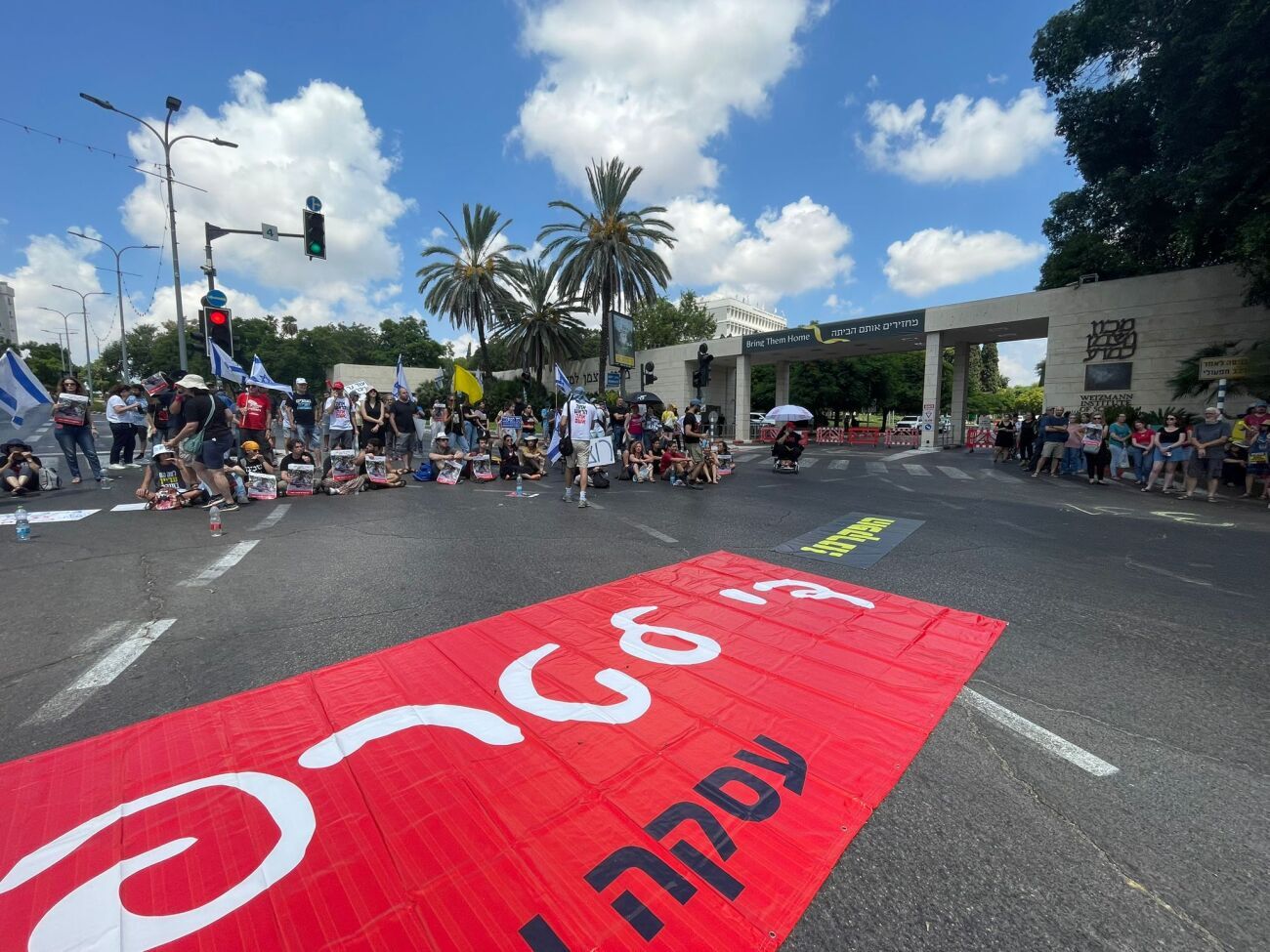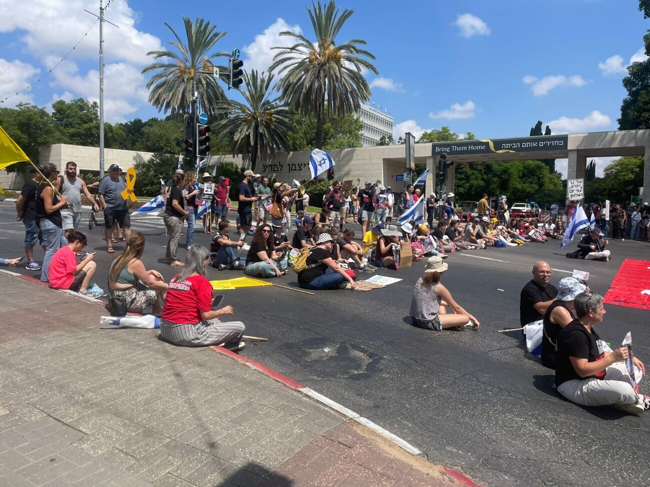 המפגינים כ - 50 במספרם יושבים על הכביש ומונעים את התנועה בדרישה שהממשלה תחתום על עסקת החטופים.