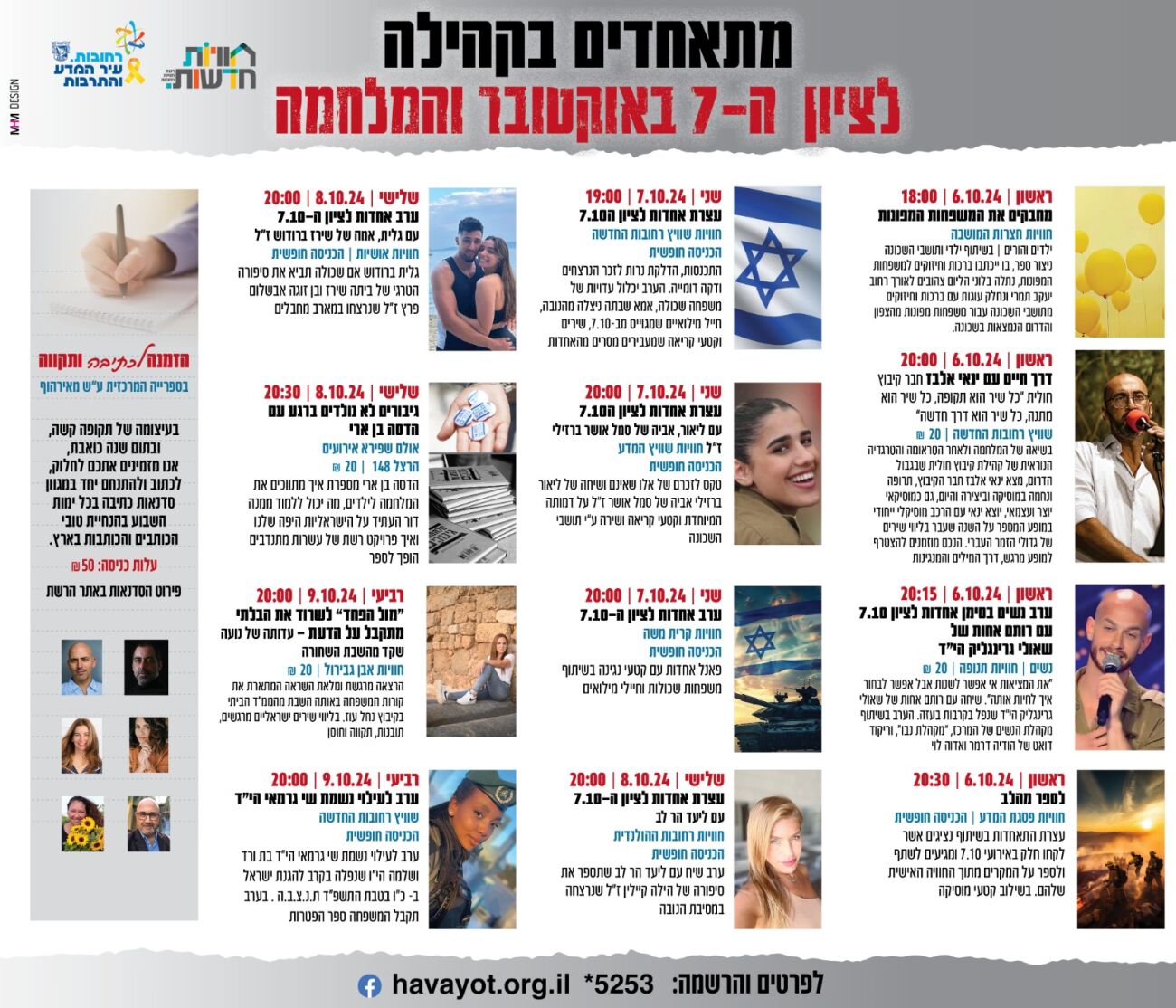 • כותבים ביחד – 6-14 באוקטובר - בספריות יתקיימו סדנאות "כתיבה ותקווה". התושבים מוזמנים לחלוק, לכתוב ולהתנחם יחד במגוון סדנאות כתיבה בהנחיית טובי הכותבים והכותבות בארץ.