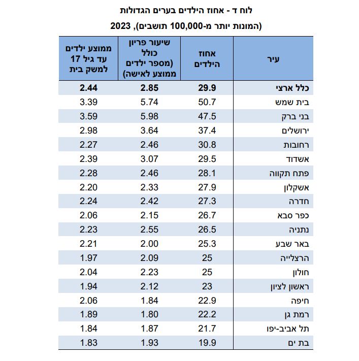בערים הגדולות המונות יותר מ100 אלף תושבים אחוז הילדים הוא 29.9%. אחוז הילדים הגבוה ביותר נמצא בבית שמש 50.7%, בני ברק 47.5% ובירושלים 37.4%.