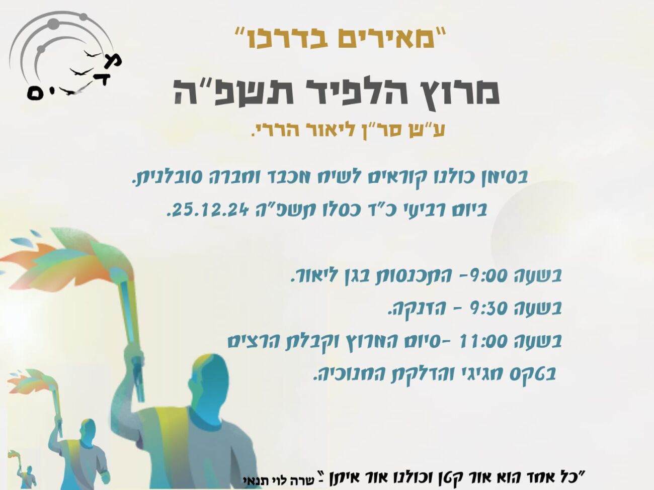 מירוץ הלפיד יתקיים זו השנה ה10 ביום רביעי 25.12.24 כשתלמידי בית הספר יחד עם בני המשפחה יוצאים למירוץ ברחבי העיר. השנה יעמוד המירוץ בסימן קריאה לשיח מכבד וחברה סובלנית.