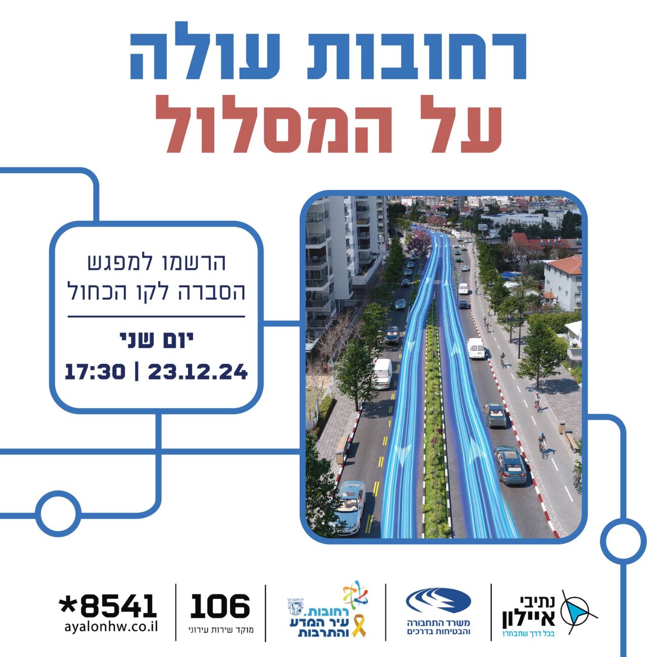 המפגש יתקיים ביום שני, 23.12, בשעה 18:00, בזום, ובמהלכו יקבלו התושבים את כל המידע אודות הפרויקט ויוכלו לשאול שאלות אודות הקו הכחול ועל מערכת הסעת ההמונים החשמלית החדשה שתקצר את זמני הנסיעה ותביא לתנופה אדירה לעסקים, לאיכות החיים ולסביבה.