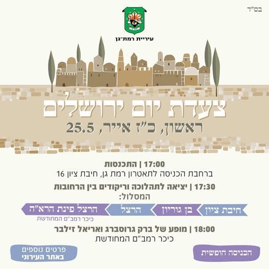 עו"ד זוהר ישרים, המשנה לראש העיר רמת גן, מזמין את התושבים: 'רמת גן צועדת באהבה לירושלים!' - תהלוכת ריקוד דגלים חגיגי ביום ירושלים. יום ראשון 25/5 התכנסות ברחבת הכניסה לתיאטרון רמת גן