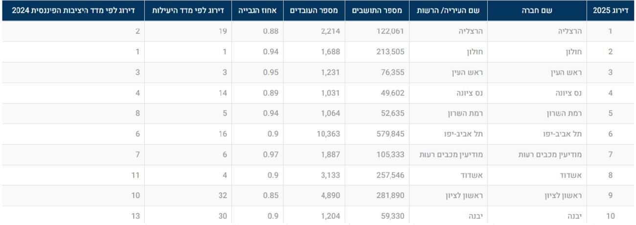 שלושת הרשויות המובילות הן: הרצליה שעלתה מהמקום השני, חולון שאבדה את המקום הראשון וראש העין ששומרת על המקום השלישי. את העשירייה הראשונה סוגרת עיריית יבנה.