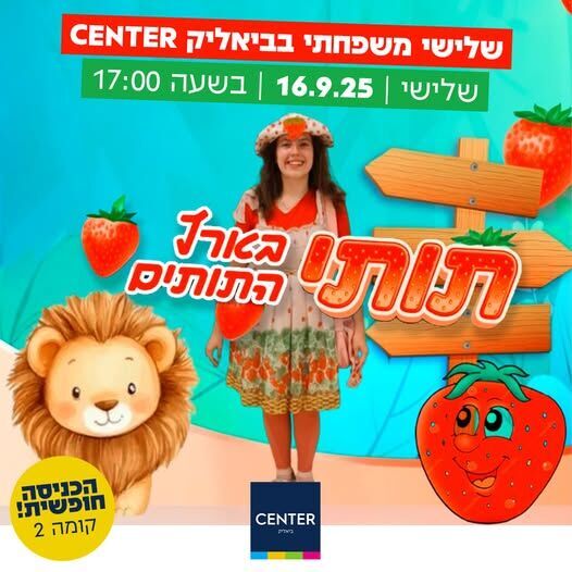 הצגת ילדים חינם בביאליק סנטר רמת גן: תותי המתוקה יוצאת למסע הרפתקאות בארץ התותים כדי להשיב את התותים האבודים לכתר המלך. שלישי 16/9