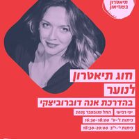 חוג התיאטרון לנוער יועבר בהדרכתה של אנה דוברוביצקי ויתקיים בימי רביעי. גם חוג זה יחולק לשתי קבוצות: בין השעות 16:30-18:00 לתלמידי כיתות ז'-ט', ובין השעות 18:30-20:00 לתלמידי כיתות י'-י"ב.