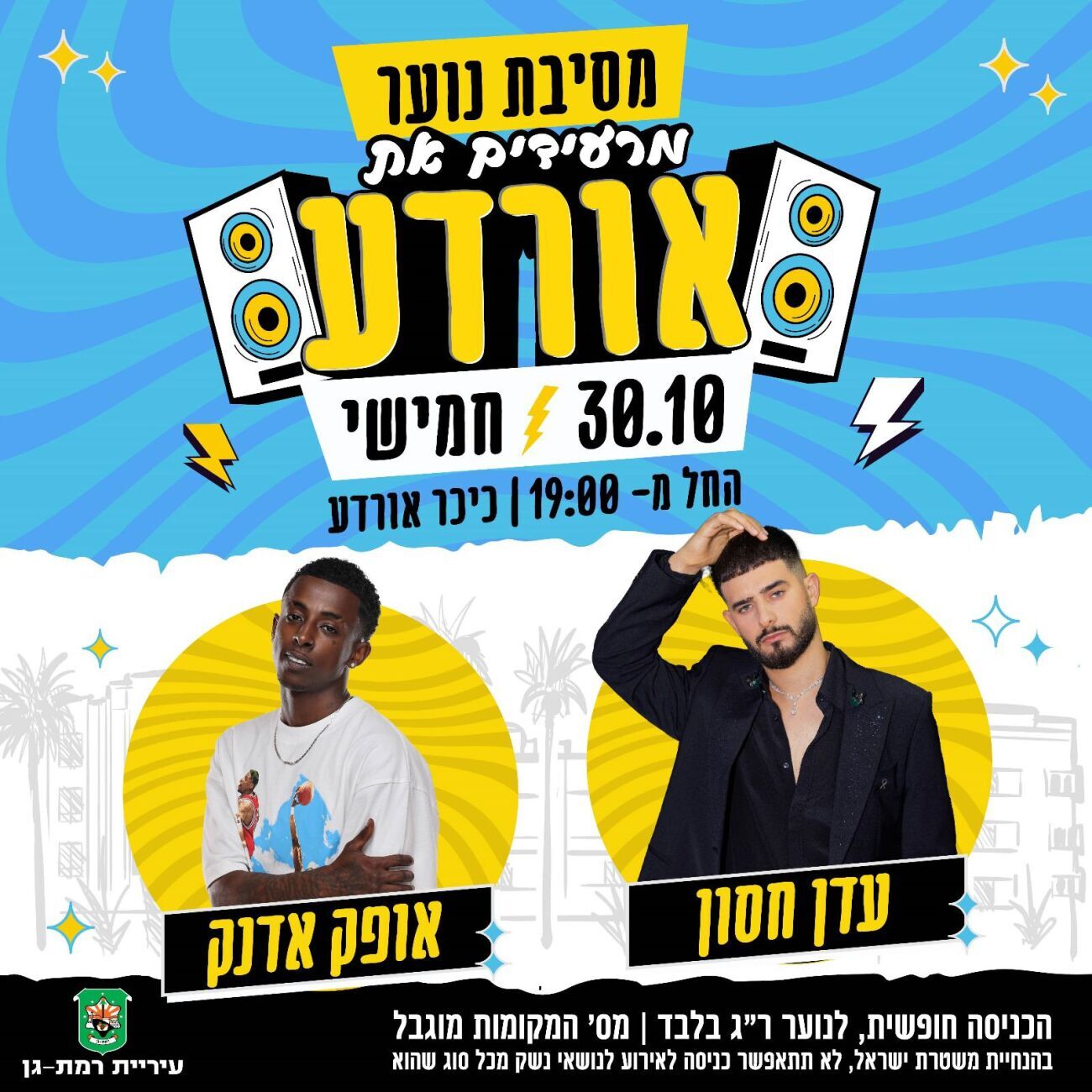 ביום חמישי, 30 באוקטובר 2025, החל מהשעה 19:00, תתקיים מסיבת נוער בכיכר אורדע. באירוע יופיעו הזמרים עדן חסון ואופק אדנק. הכניסה חופשית ומיועדת לנוער תושבי רמת גן בלבד. מספר המקומות מוגבל ומומלץ להגיע מוקדם.