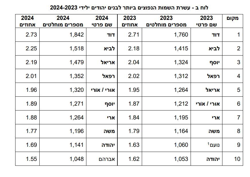 בקרב הבנים במגזר היהודי, השם הנפוץ ביותר הוא דוד, שניתן ל-1,842 תינוקות. אחריו ברשימה נמצאים לביא עם 1,518 תינוקות ואריאל עם 1,479 תינוקות.