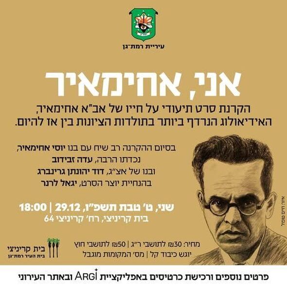 ביום שני 29.12 תתקיים הקרנת הסרט הדוקומנטרי "אני, אחימאיר" במוזיאון בית קריניצי ברמת גן ומפגש עם הבמאי יגאל לרנר ובני משפחת אחימאיר וגרינברג